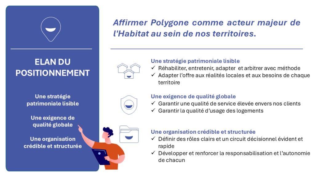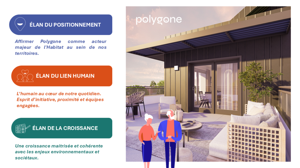 Polygone affirme sa volonté de conforter sa place d’acteur majeur de l’habitat sur ses territoires. Cela passe par une stratégie patrimoniale lisible, une exigence de qualité globale et une organisation crédible, structurée, capable de décider avec clarté et efficacité.